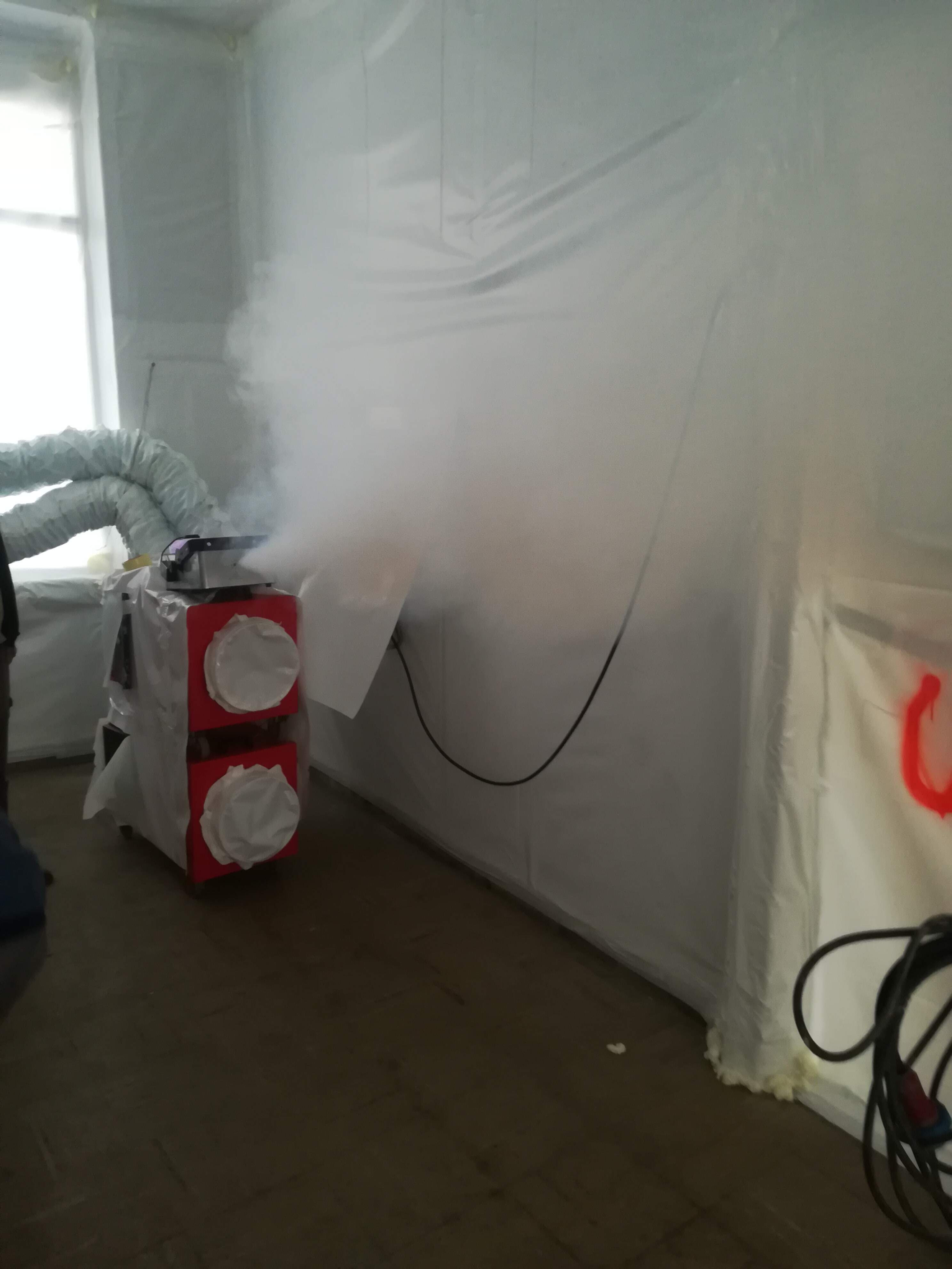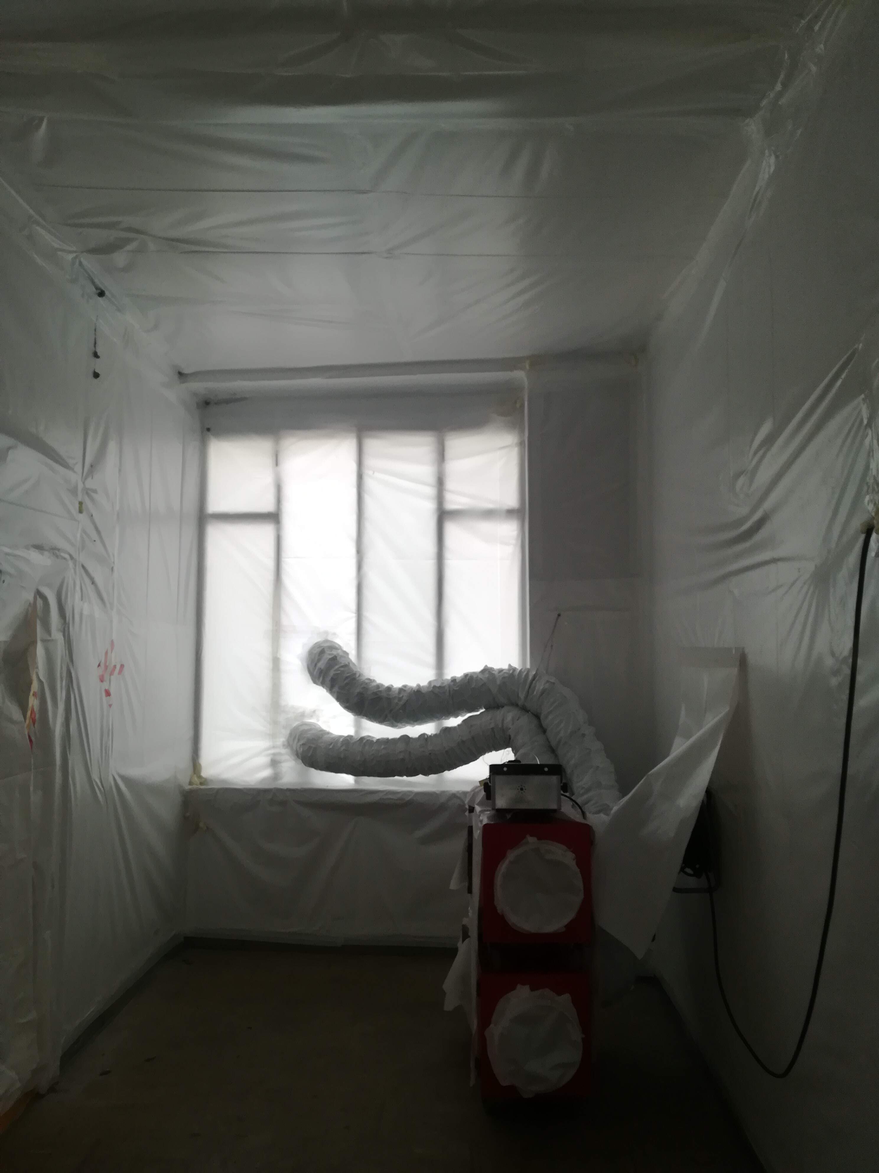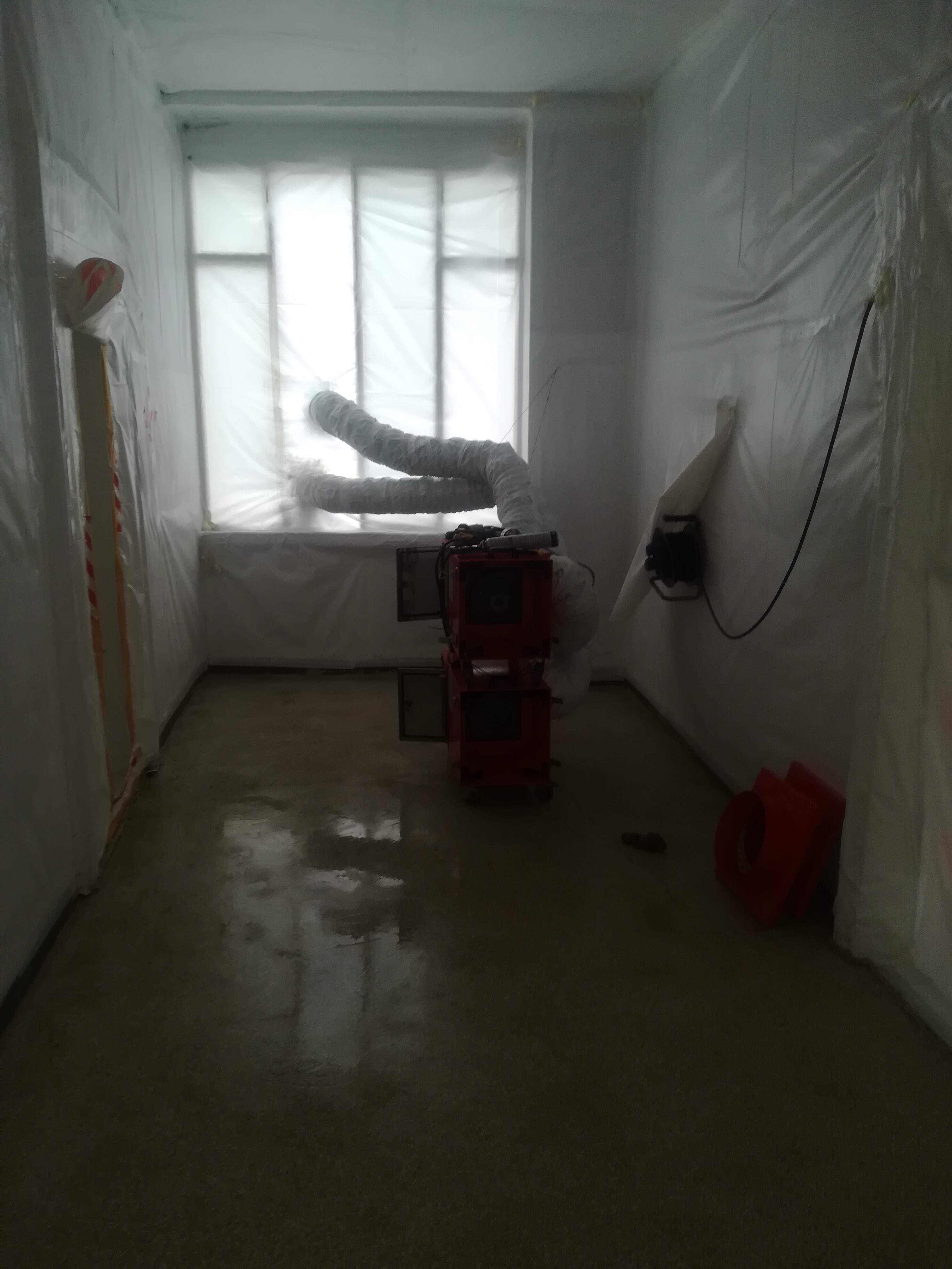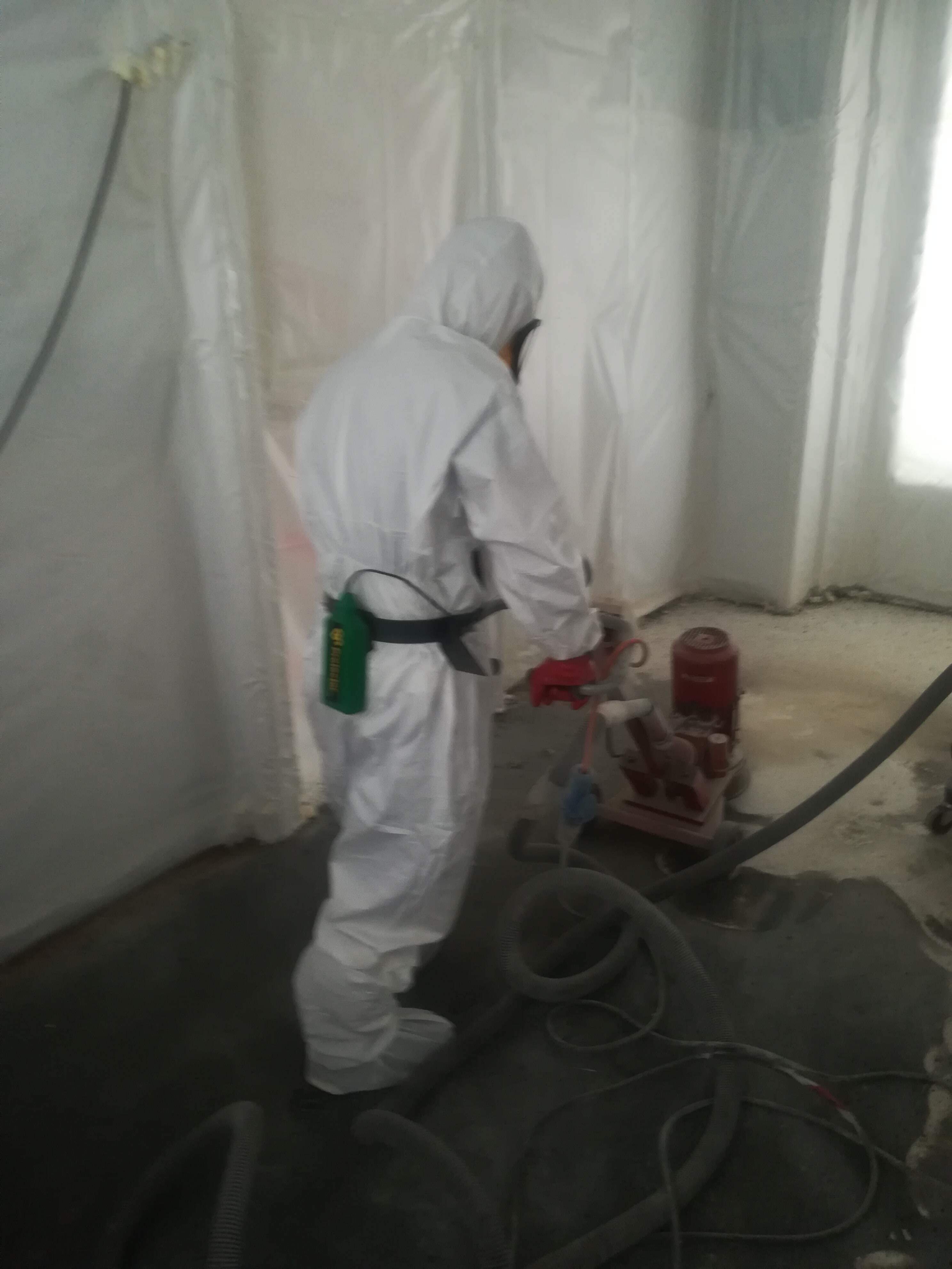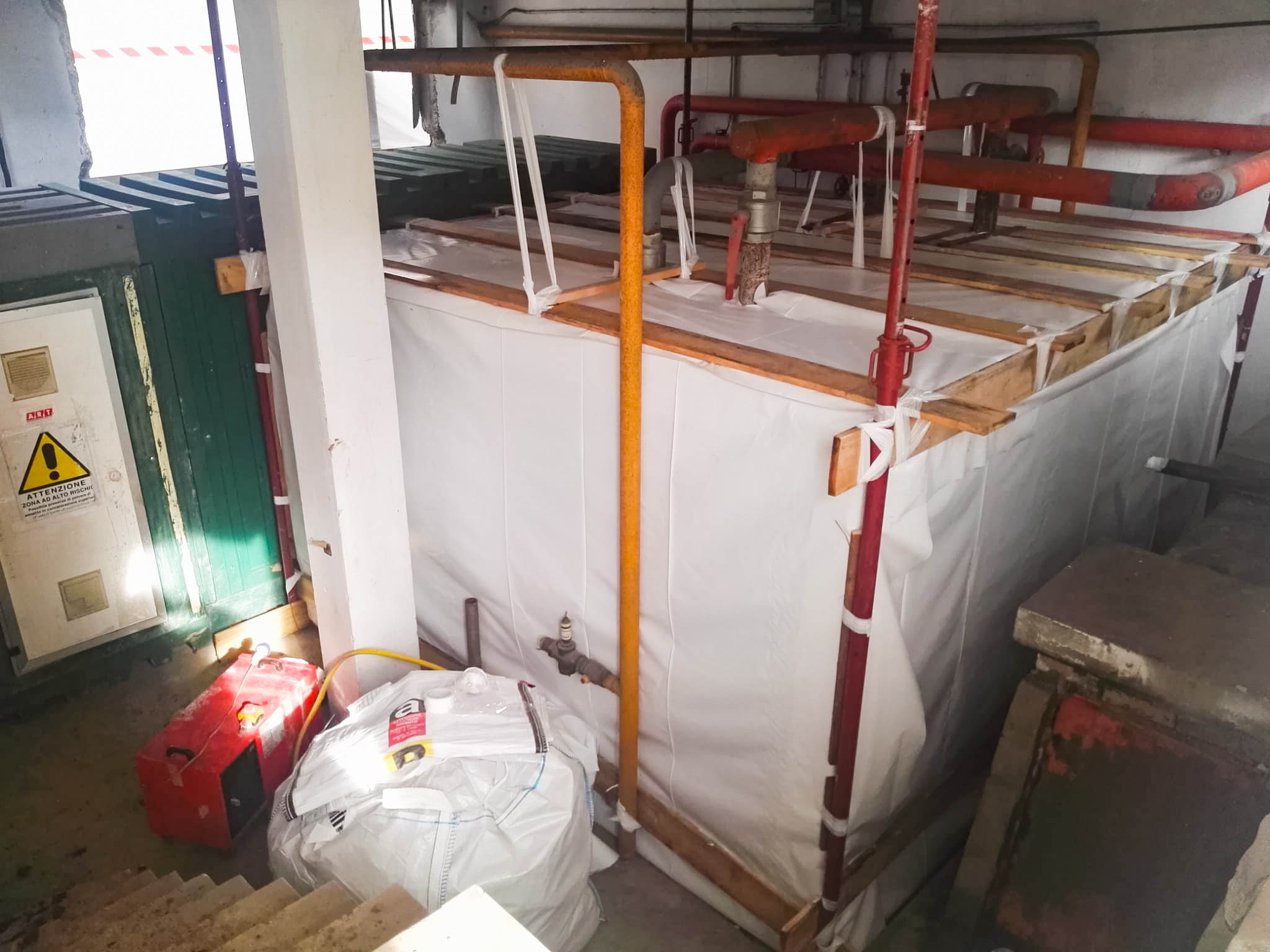 I lavori di bonifica dell'amianto friabile (floccato) vengono eseguiti definendo un'area confinata, rispettando rigorosamente tutte le procedure di ingresso e di uscita degli operatori.